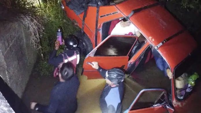 Ante la alerta recibida, personal de Bomberos Voluntarios se desplazó rápidamente hacia el kilómetro del accidente. Los rescatistas debieron emplear herramientas especializadas para trabajar de forma intensiva en la extracción de los ocupantes, quienes permanecían dentro del auto mientras el agua del arroyo circulaba por el sector. El operativo se realizó bajo estrictos protocolos de seguridad para evitar lesiones adicionales durante la remoción de los hierros.
